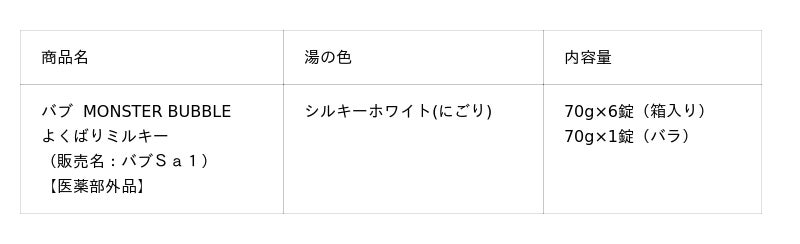こうした背景を踏まえ、「モンスターバブル」シリーズならではの70gのBIG*5 タブレットや強炭酸チャージ*3 といった特長に加えて、バブ史上最高の白濁濃度*1 で贅沢気分を味わえる新商品「よくばりミルキー」を発売いたします。また、本商品は、贅沢保湿成分(CICA成分*6、ヒアルロン酸、うるおいオイル*7)を配合。CICA成分*6 はバブ錠剤で初めて配合しました。