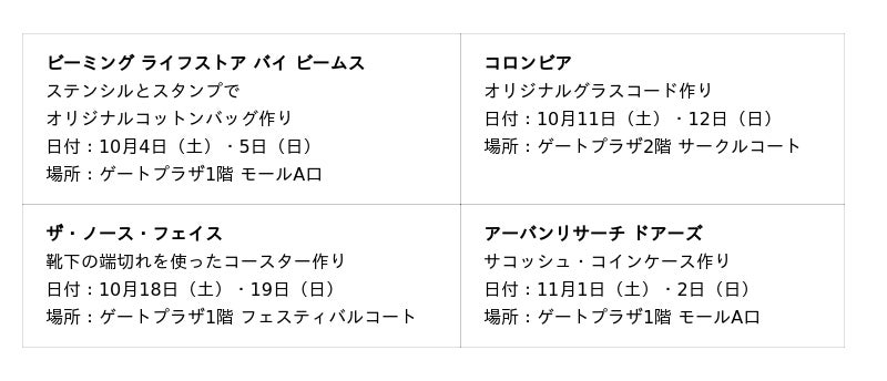 10月4日(土)から11月2日(日)まで、店舗主催のワークショップを開催します(全18店舗)