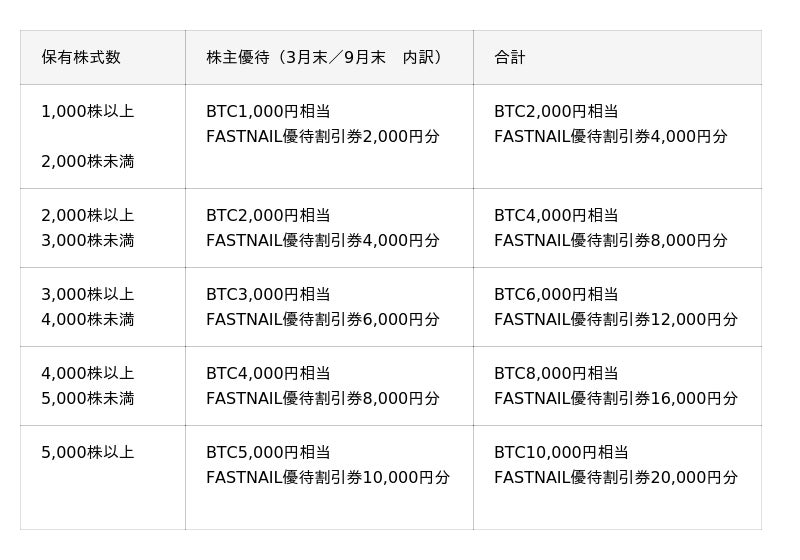 保有株式数に応じて、以下のとおりビットコイン及びFASTNAIL優待割引券を贈呈いたします。(基準日時点のビットコイン価格に基づき贈呈予定です。基準に該当した個人の株主様全員に贈呈するもので抽選ではありません。