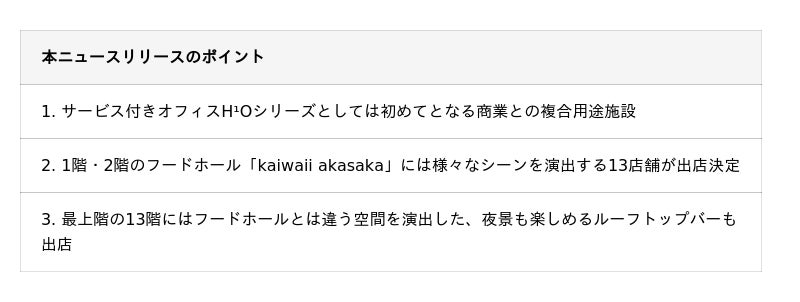 野村不動産株式会社(本社:東京都港区/代表取締役社長:松尾 大作、以下「野村不動産」)、野村不動産コマース株式会社(本社:東京都港区/代表取締役社長:鵜沼 孝之、以下「野村不動産コマース」)は野村不動産が開発するオフィスビル「H¹O赤坂(東京都・港区/以下「本物件」)」内に、地域の社交場となるような賑わいを目指したフードホール「kaiwaii akasaka」を2025年10月29日(水)に開業することをお知らせいたします。