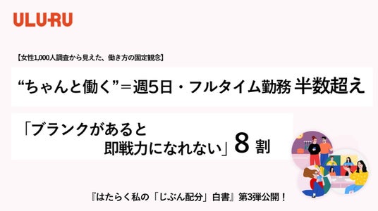 労働力不足問題解決のリーディングカンパニーとして、複数の SaaS を展開する株式会社うるる(本社:東京都中央区、代表取締役社長:星知也、以下「うるる」)は、女性の働き方と生活のバランスに関するプロジェクト『はたらく私の「じぶん配分」白書』のコンテンツ第 3 弾を追加公開しました。(はたらく私の「じぶん配分」白書:https://www.uluru.biz/mlp/jibunhaibun)