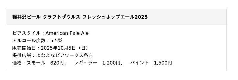 株式会社ワンダーテーブル(本社:東京都新宿区西新宿、代表取締役社長:河野 博明)は、よなよなエール公式ビアレストラン『よなよなビアワークス』にて、2025年10月5日(日)より「軽井沢ビール クラフトザウルス フレッシュホップエール2025」を数量限定で販売します。