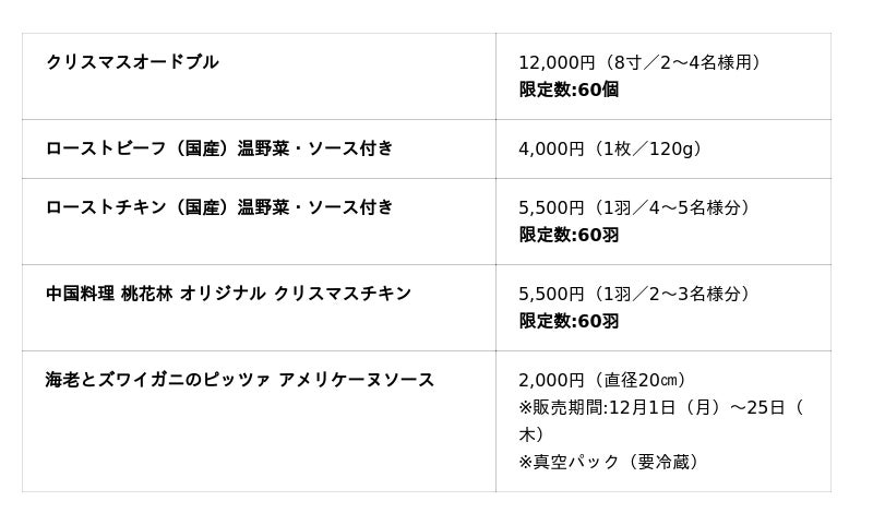 ※ローストチキン、ローストビーフ、桃花林チキンのご予約は、12月14日(日)まで