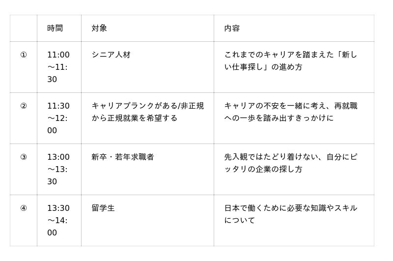 一般求職者(就職・転職希望者、復職を目指す女性等)、シニア人材(概ね55歳以上の求職者)、留学生(高度外国人材)、新卒学生(2026年3月卒業予定者)