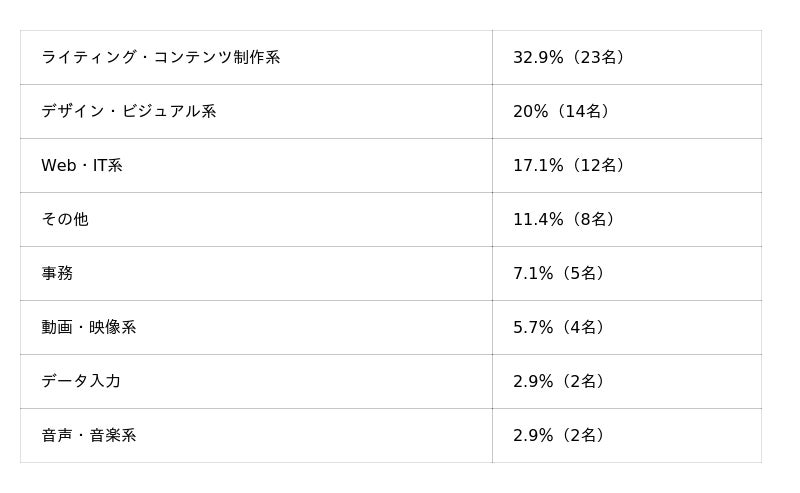 ライティング、デザイン、Web・IT系を合わせると全体の70%を占めており、PCでのデスクワークが中心の職種がほとんどです。