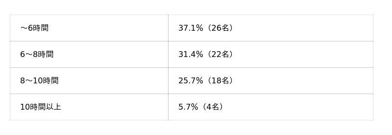 労働時間は「6時間以上」と回答した人が60%以上にのぼり、フルタイムもしくはそれに近い形で働いている方が多いことが推測されます。
