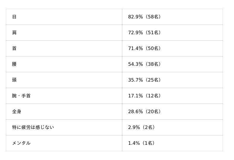 「目の疲労」が80%以上と突出しており、次いで「肩」「首」が70%以上と続きます。