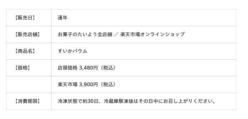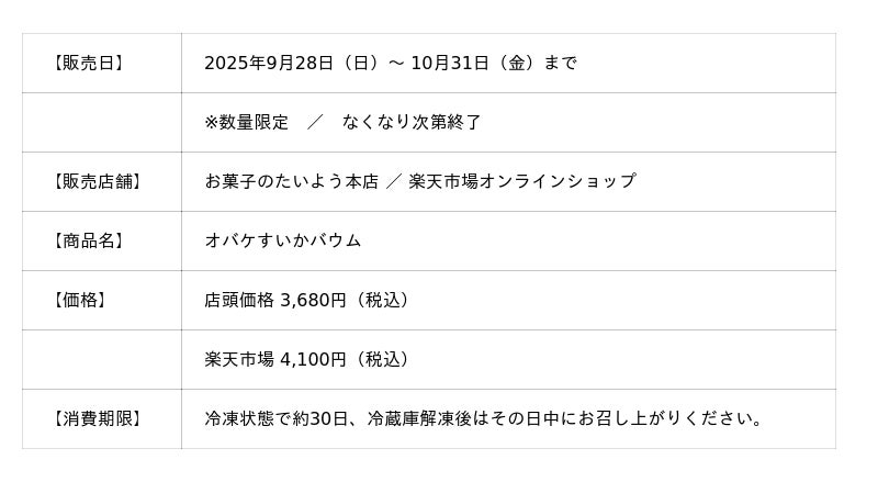 株式会社太陽社(所在地:千葉県匝瑳市飯倉293、代表取締役:片岡正裕)が展開する千葉県で長年愛される菓子店「お菓子のたいよう」は、楽天ランキング入賞数6,500回以上、販売開始1時間で655個完売の実績を誇る大人気商品「すいかバウム」を、初のハロウィン限定デザインで9月28日(日)より発売いたします。