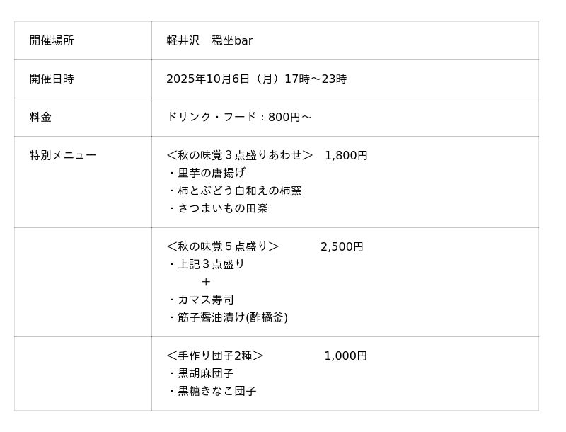 シマダグループ(東京都渋谷区、代表:島田成年)は、軽井沢の穏坐barにて「中秋の名月 穏坐bar×吉川醸造 コラボレーションイベント」を2025年10月6日(月)に開催します。「吉川醸造の杜氏と語らう月見酒」をテーマに、日本酒だけでなく、秋の食材を使った特別料理や月見団子をお楽しみいただけます。私たちは、酒の作り手とのコミュニケーションやイベント限定のお酒を通じて、新たなコミュニティの形成といい時間(とき)の創造を目指しています。