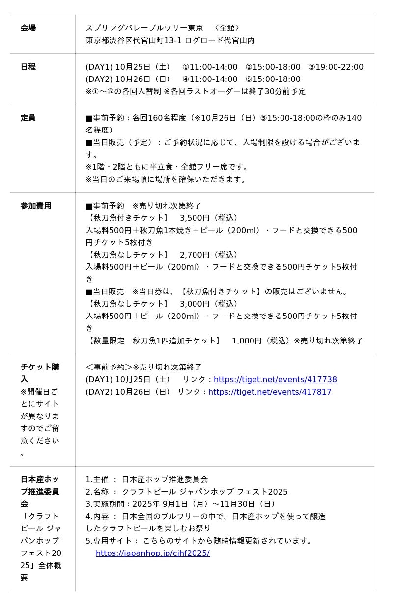 本イベントは、全国から集まった17社のブルワリーやホップ生産者、醸造家、ビールファンが一堂に会し、交流できるイベントです。さらに今年は開催10年目を迎え、日本産ホップで醸造した最大20種類のクラフトビールだけでなく、秋の風物詩である“秋刀魚の一本焼き”とともにお楽しみいただけます。また、ホップの香りを嗅ぎ分ける「利きホップ」体験や、人気アーティストによる限定ライブなど、日本産ホップを五感で楽しめる特別企画も満載です。