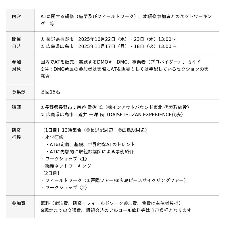 この度、日本政府観光局(JNTO)では、日本国内においてアドベンチャートラベル(以下、「AT」という)に関わるDMC、事業者等の全国的なネットワーク強化を目的とした研修を実施します。(東日本・西日本エリア各1回)
