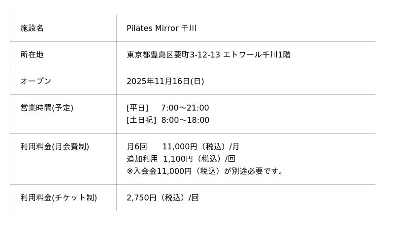 コナミスポーツ株式会社(以下、「弊社」)は、天井にミラーを設置したマシンピラティススタジオ「Pilates Mirror 相模原(神奈川県相模原市)」と「Pilates Mirror 千川(東京都豊島区)」を2025年11月16日(日)にオープンします。