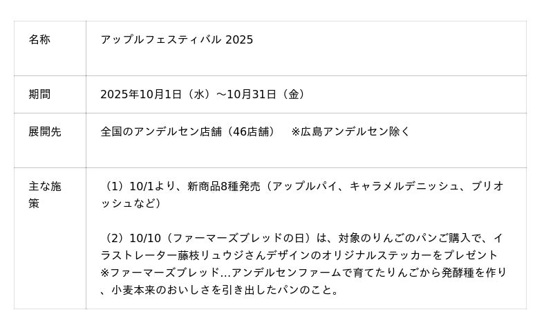 デンマークのライフスタイル“ヒュッゲ”を提案する株式会社アンデルセン(本社:広島市中区鶴見町2-19、代表取締役 社長執行役員:松本 真一)は、広島県北広島町の「アンデルセンファーム」で収穫した”芸北りんご”を主役とする「アップルフェスティバル2025」を、10月1日(水)から開催します。
