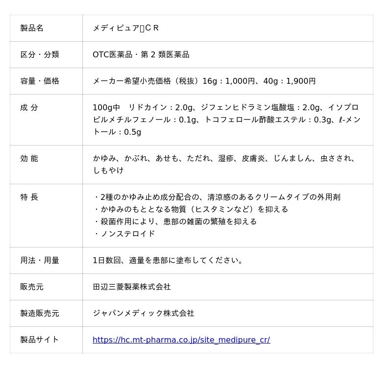 田辺三菱製薬株式会社(本社:大阪市中央区、代表取締役CEO:原田明久、以下「田辺三菱製薬」)は、デリケートエリア(陰部)のかゆみ・かぶれを治す外用剤「メディピュア(R)ST」(OTC医薬品:指定第2類医薬品)「メディピュア(R)CR」(OTC医薬品:第2類医薬品)を、10月10日(金)から全国の薬局・薬店、ドラッグストアなどで発売します。