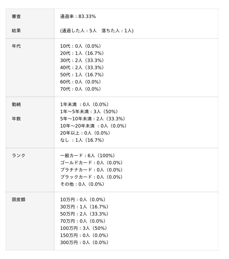 その他の方は限度額が100万円と比較的に高いものの勤続年数が長いことから審査に通過している傾向が見られました。