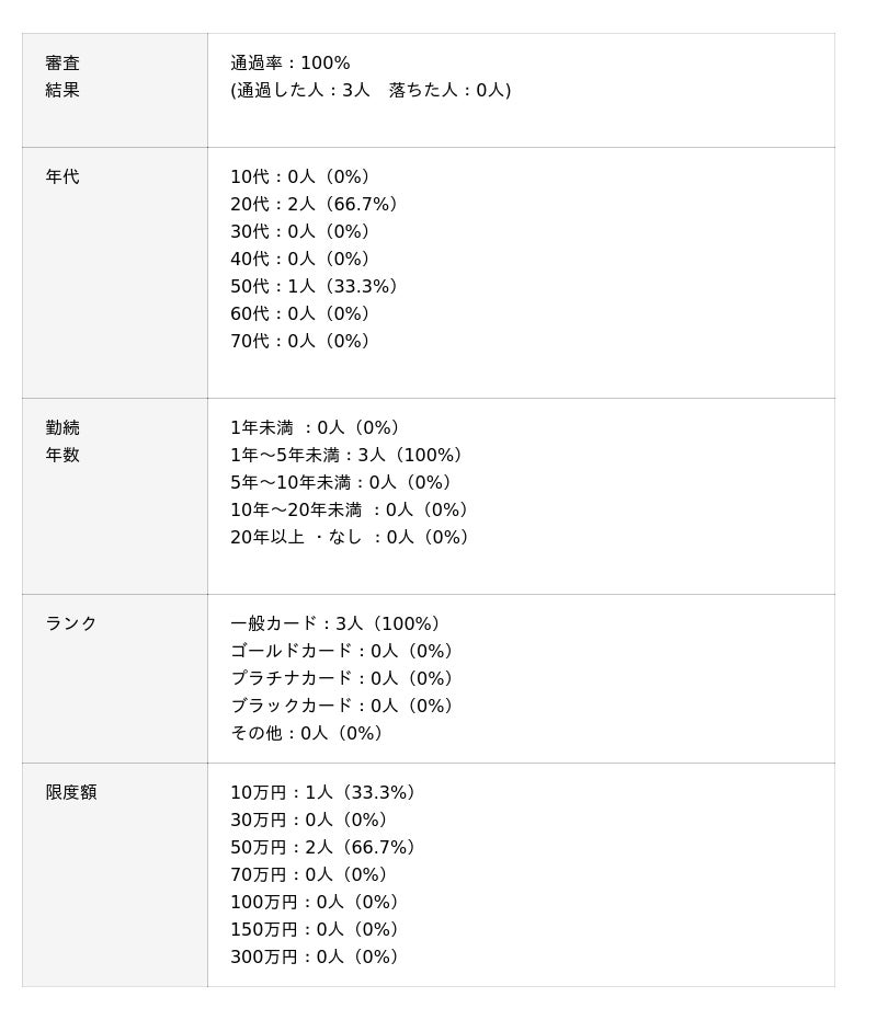 審査に通過した方は勤続年数が1~5年以内で他社と差分はありませんが他社と比較して限度額が150万円と高い傾向がありました。