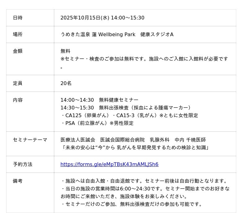 「うめきた温泉 蓮 Wellbeing Park」(総支配人:藤立 達哉、所在地:大阪市)は、2025年10月15日に、提携医療機関である医療法人医誠会(代表者:谷 幸治、本社:大阪市)の「医誠会国際総合病院」の医師を講師に招き、第6回健康セミナーを開催することをお知らせします。