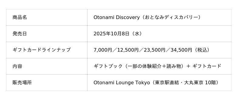 J-CAT株式会社(本社:東京都港区、代表取締役:飯倉 竜)が運営する、大人のための非日常体験をお届けする「Otonami(おとなみ)」は、“体験を贈る”をテーマにしたギフトブック「Otonami Discovery(おとなみディスカバリー)」を、2025年10月8日より東京駅直結の大丸東京店内にある「Otonami Lounge Tokyo(おとなみ らうんじ とうきょう)」にて、販売を開始いたします。