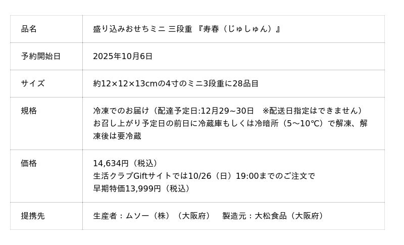 生活クラブ事業連合生活協同組合連合会(本部:東京都新宿区、会長:村上彰一、以下生活クラブ)は国産の原材料や食品添加物削減を追求したミニサイズのおせち三段重『寿春(じゅしゅん)』の早期予約を10月6日より開始しました。