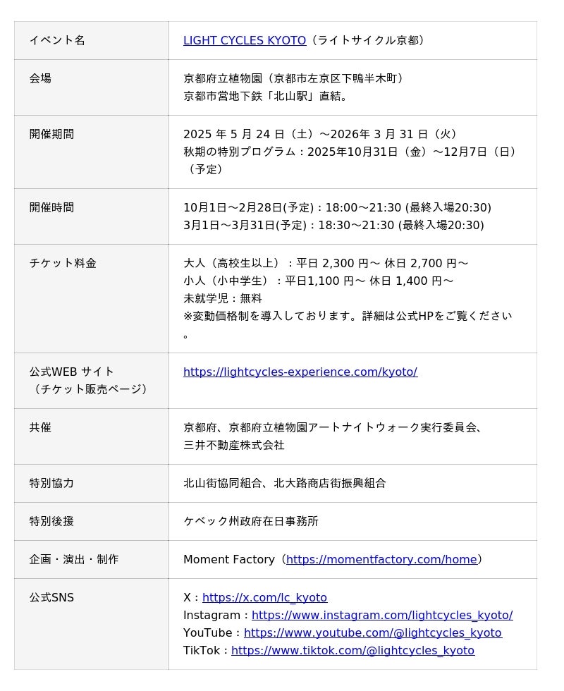 京都府、京都府立植物園アートナイトウォーク実行委員会(以下「実行委員会」)及び三井不動産株式会社(本社:東京都中央区、代表取締役社長:植田俊、以下「三井不動産」)は、京都府立植物園を夜間に開放し、光と音が織り成す新たな植物の魅力を五感で感じる没入型体験イベント「LIGHT CYCLES KYOTO(ライトサイクル京都)(以下、「本イベント」)」 にて、2025年10月31日から12月7日(予定)までの期間、秋ならではの新たなアートイルミネーション企画を実施することをお知らせします。