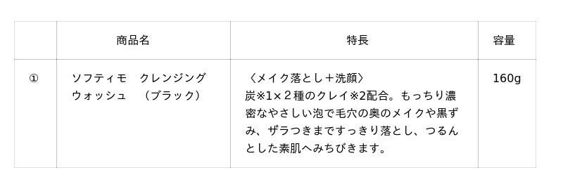 近年、「毛穴ケア」の訴求が高まっており、当社の調査では、クレンジングの機能で「毛穴汚れ」や「角栓ケ ア」を重視する方は、利用者全体の半数近くにのぼることが分かりました。また毛穴ケアの成分として、炭や クレイは毛穴の汚れや余分な皮脂を吸着し、しっかり落とすことで注目が集まっています。 このようなニーズから、クレンジング市場において人気を誇る「ソフティモ クレンジングウォッシュ」シリーズ より、毛穴ケアを訴求したブラックタイプを発売いたします。 「ソフティモ クレンジングウォッシュ (ブラック)」は、炭と 2 種のクレイを配合。毛穴の奥の黒ずみやザラつ きまですっきり落とし、つるんとした素肌へみちびきます。また、メイク落としと洗顔が同時におこなえ るため、 落ちにくいメイクや毛穴の奥の汚れまで 1 度でしっかり落とします。 これから乾燥が気になる季節にも、乱れがちな毛穴のケアとして 性別問わずご使用いただける 1 本です。