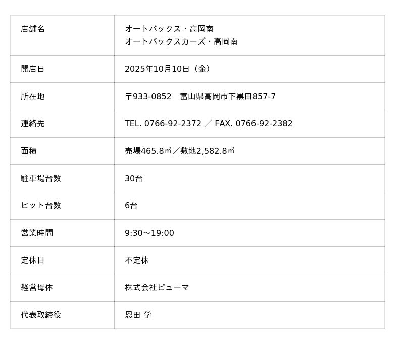 株式会社オートバックスセブン(代表取締役 社長:堀井勇吾)と加盟店契約を結んでいる株式会社ピューマ(代表取締役:恩田学)は、2025年10月10日(金)に「オートバックス・高岡南(たかおかみなみ)」および「オートバックスカーズ・高岡南」を新規オープンいたします。