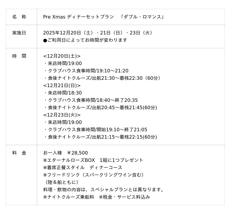 「ダブル・ロマンス」~陸と海の饗宴。陸上でゆったりとディナーを楽しむ時間と、食後に夜景とフリードリンクを満喫するロマンティックなクルーズの2部構成。他にはない新しいクリスマス体験をお届けします。