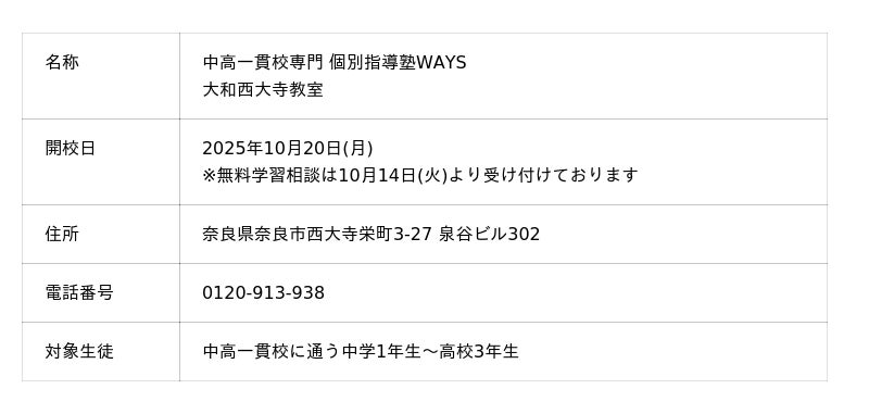 中高一貫校専門 個別指導塾WAYS(運営:株式会社メイツ、本社:東京都新宿区)は、これまで多くの保護者様からご要望の声をいただいていた奈良県に、来る2025年10月20日(月)、満を持して『WAYS 大和西大寺教室』を新規開校します。
