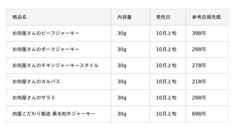 ジャーキーやカルパスなどの乾燥食肉製品は、手軽に“お肉のおいしさ”を楽しめる商品として、幅広い層から支持を集めています。単身世帯の増加により、少量・個包装タイプの需要も拡大しています。