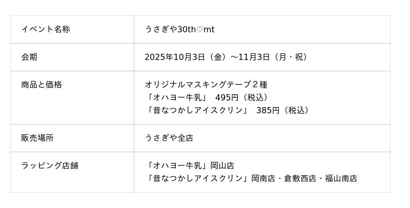さらに、岡山県および広島県内の「うさぎや」4店舗ではこれらのマスキングテープを使用した店内ラッピングも実施され、特別な空間をお楽しみいただけます。