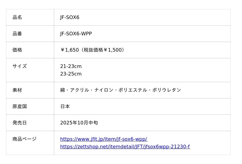 ゼット株式会社(本社/大阪市天王寺区、代表取締役社長/渡辺裕之)のオリジナルブランド『JFIT』(ジェイフィット)は、人気の足袋型ソックスの6cm丈【JF-SOX6】からイエローパープルピンクのパステルカラーの刺しゅうが入った可愛らしい新色を2025年10月中旬に発売しました。