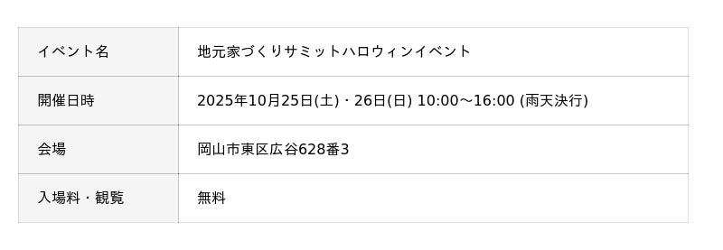 岡山の不動産会社ノマド株式会社(主催)と、WEBサイト制作やブランディング支援を行う株式会社クラビズが企画・運営を手掛ける、住宅展示場『岡山地元家づくりサミット』(所在地:岡山市東区広谷)が、2025年10月25日(土)・26日(日)の2日間、ご家族で楽しめる「ハロウィンイベント」を開催いたします。
