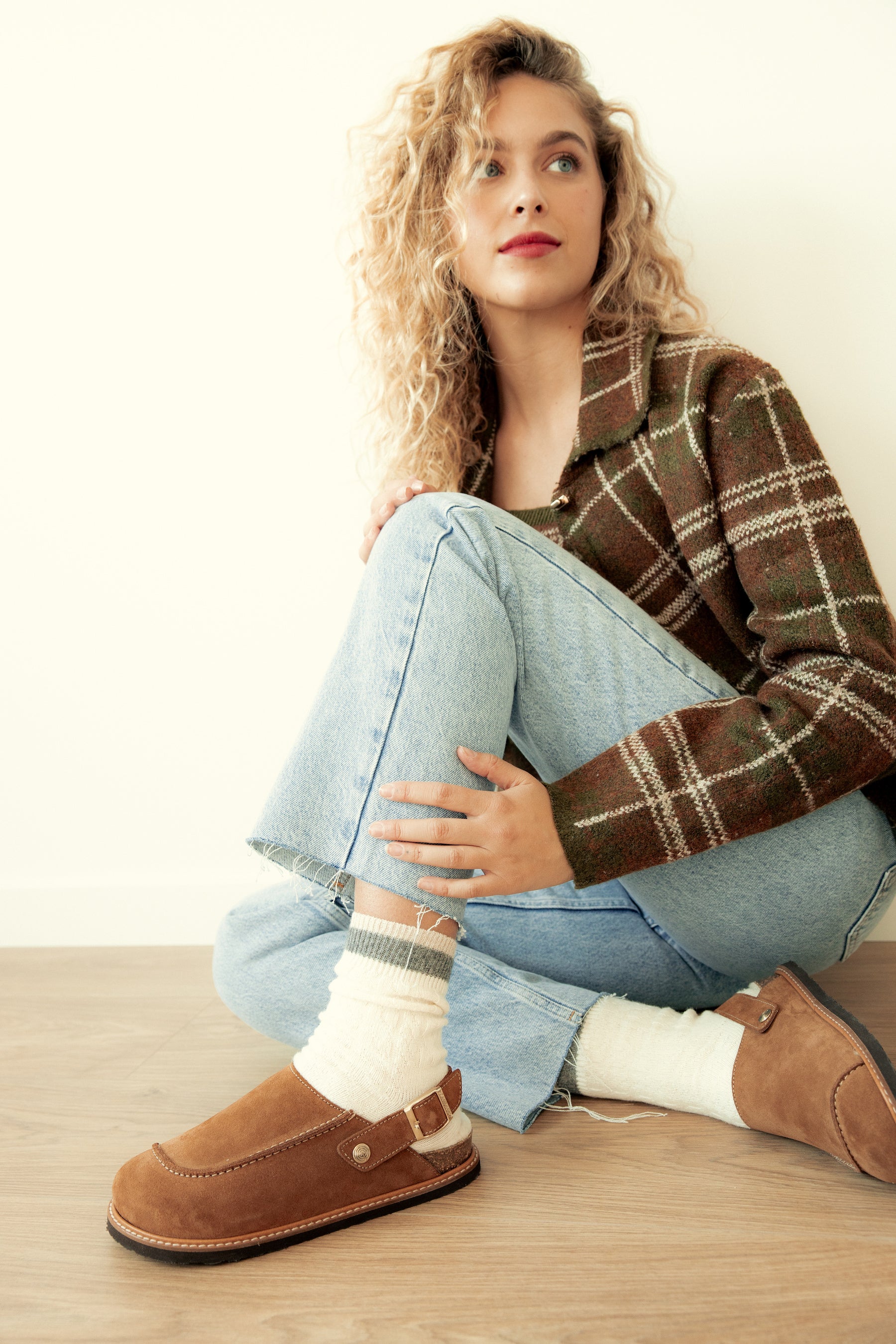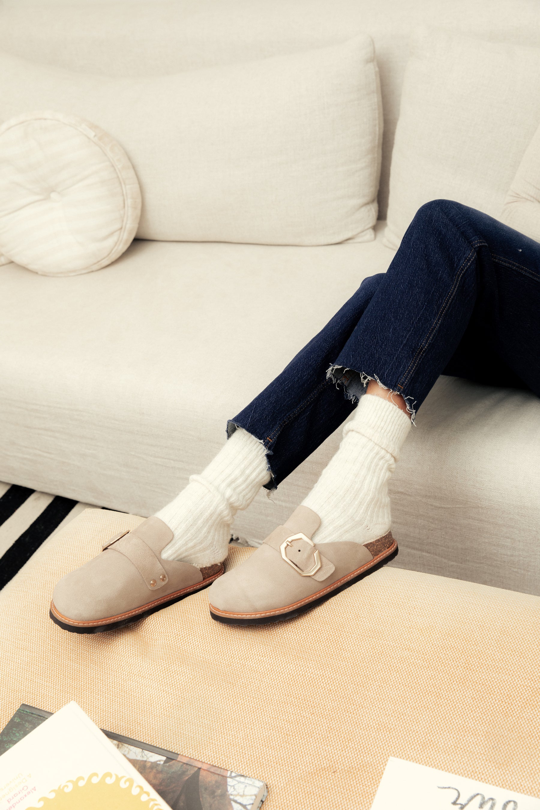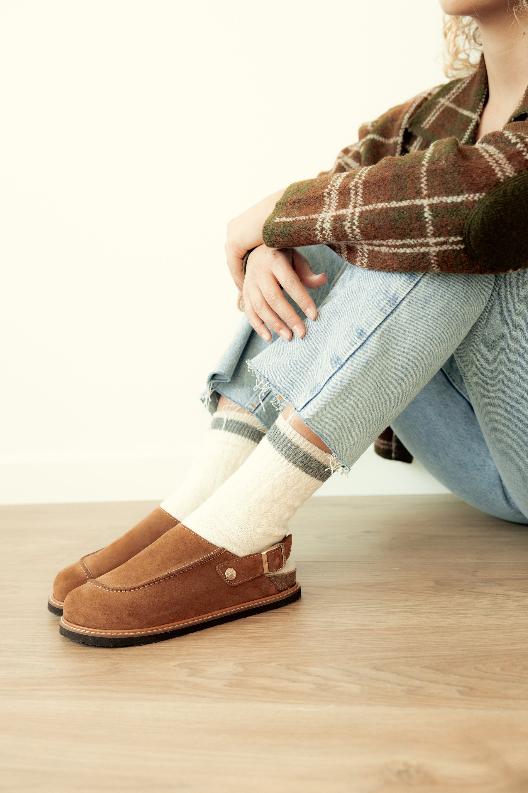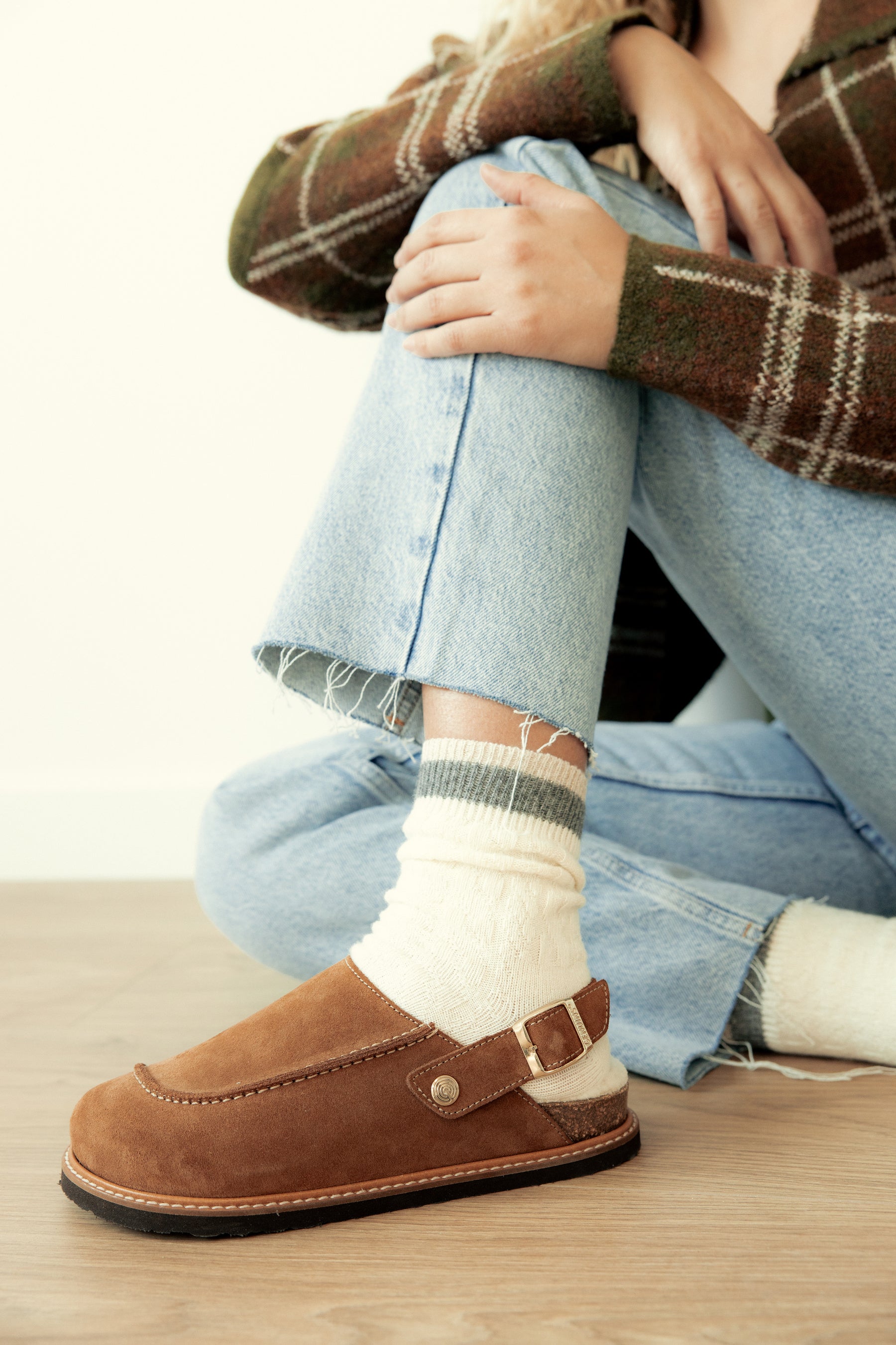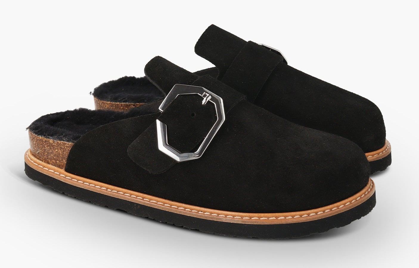 暖かみのあるベロアレザー(起毛革)をアッパーに採用した新モデル。6角形のビッグバックルのベルトストラップでフィット感を調整可能。フットベッドには天然ウールのボア素材を配し、暖かくソフトな履き心地です。天然コルクのミッドソールと人体構造に基づいて設計されたフォームのフットベッドが足への圧力を分散して安定性を高め、足の疲労を和らげて快適な歩行をサポートします。アウトソールは軽量EVA。