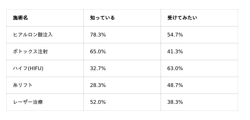その結果、「ヒアルロン酸注入」は認知度・希望度ともに高い一方で、効果的とされる「ハイフ(HIFU)」や「糸リフト」については、受けてみたい人は多いものの、実際の認知度は低いことが分かりました。