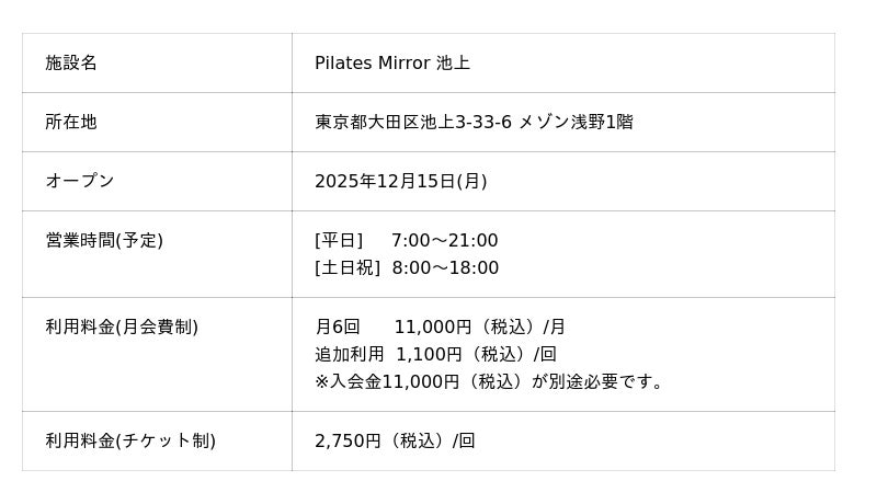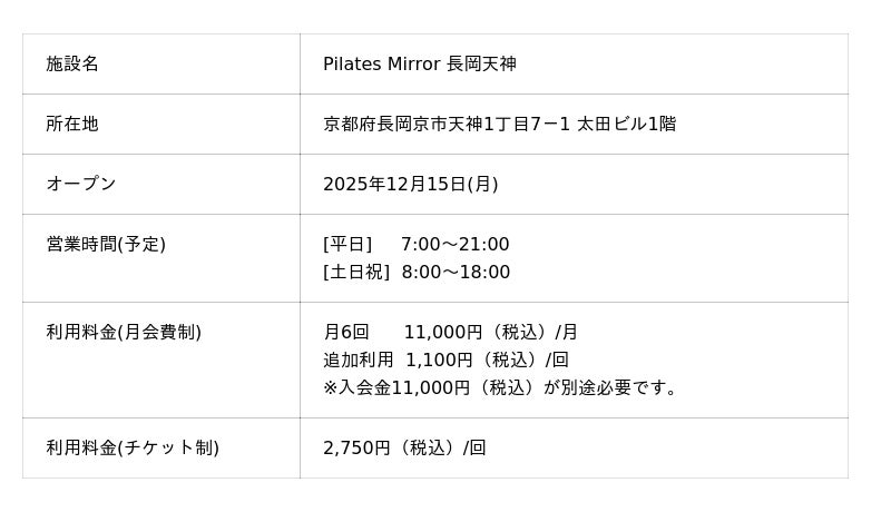コナミスポーツ株式会社(以下、「弊社」)は、天井にミラーを設置したマシンピラティススタジオ「Pilates Mirror 長岡天神(京都府長岡京市)」と「Pilates Mirror 池上(東京都大田区)」を2025年12月15日(月)にオープンします。