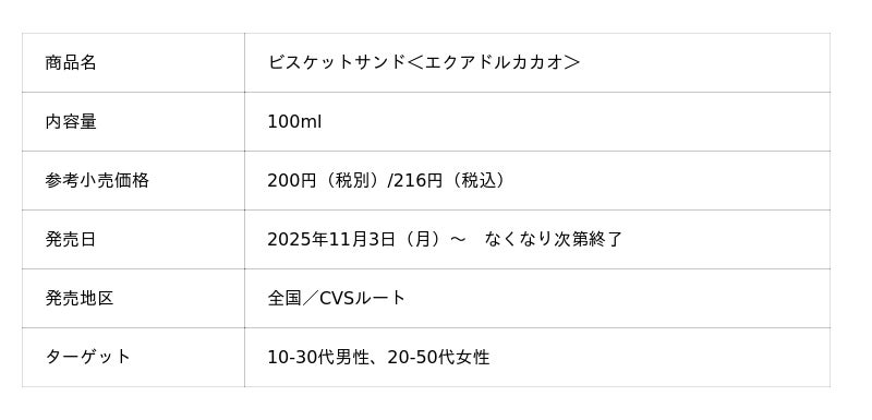 立冬を目前に控え、一層肌寒くなるこのタイミングで、しっとりココアビスケットとカカオのコク深いチョコアイスクリームで、心も小腹も満たす、シンプルリッチな上質サンドアイスの発売により、贅沢な時間を演出し、お客様に笑顔をお届けしてまいります。