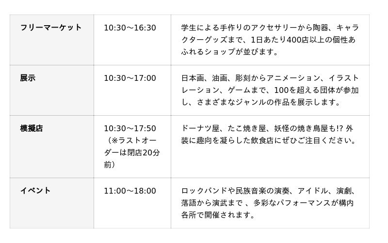本学の学園祭は、その特色から「芸術祭」と呼ばれ、毎年秋に学生の自主的な創意と協力のもとで開催されています。日頃の制作成果を発表する展示や、外装にこだわった模擬店は、一般の来場者にも毎年好評を博しています。そのほか、ステージやホールでの発表、野外での練り歩きパフォーマンスなど、さまざまなイベントも実施される予定です。