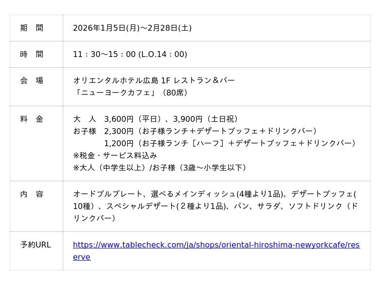 オリエンタルホテル広島(所在地:広島県広島市中区田中町6-10、総支配人:上野 裕二)の1階レストラン&バー「ニューヨークカフェ」では、2026年1月5日(月)から2月28日(土)までの期間限定で、「デザートブッフェ付きランチ 2026 Winter」を提供します。