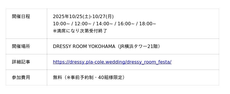 「PLACOLE & DRESSY」ブランドを展開する冒険社プラコレ(本社:神奈川県鎌倉市、代表取締役CEO:武藤功樹)は、横浜駅直結JR横浜タワー21F、ウェディングの魔法にかかる空間”DRESSY ROOM YOKOHAMA”にて、10/25(土)-10/27(月)の3日間限定で、これから結婚式をお考えのカップル様に向けた、個室相談やウェディングドレス試着ができる豪華特典付きのウェディング初体験フェスを開催いたします。(40組様限定、無料開催)