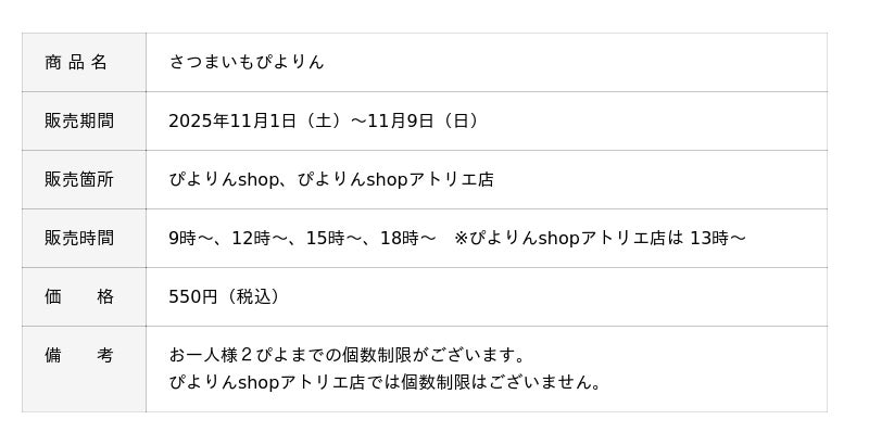 ジェイアール東海フードサービス株式会社(本社:愛知県名古屋市、代表取締役社長:岩下賢一)は、人気スイーツ「ぴよりん」の季節限定商品「さつまいもぴよりん」を、2025年11月1日(土)~11月9日(日)まで販売いたします。秋の味覚・さつまいもを使った、ほっくりとやさしい甘さが広がる限定ぴよりんです。
