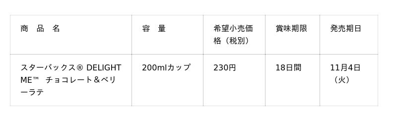 スターバックス・コーポレーション(本社:米国 シアトル、CEO:ブライアン・ニコル)と、サントリー食品 インターナショナル株式会社(本社:東京都、社長:小野真紀子)は、スターバックスのチルドカップシリーズより「スターバックス(R) DELIGHT ME(TM) チョコレート&ベリーラテ」を、11月4日(火)から期間限定で発売します。
