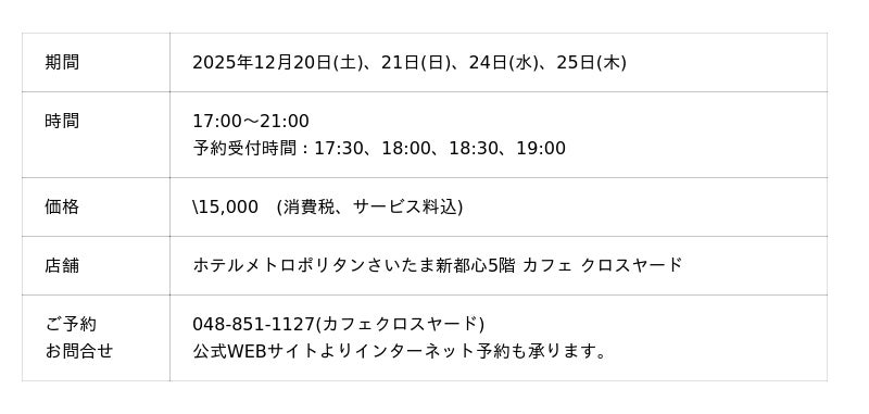 ホテルメトロポリタン さいたま新都心(所在地/さいたま市中央区、総支配人/櫻井浩一)のカフェクロスヤードでは、クリスマス限定のディナーコースを販売いたします。