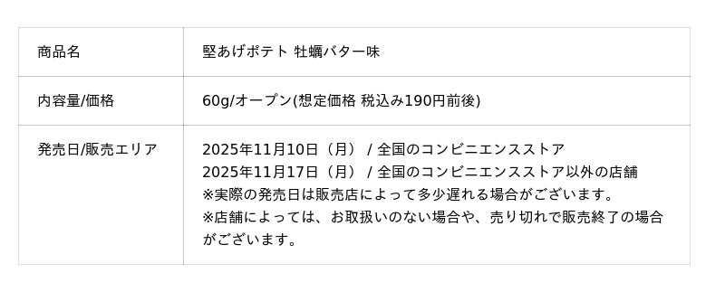 カルビー株式会社(本社:東京都千代田区、代表取締役社長兼CEO: 江原 信)は、“噛むほどうまい!”堅い食感が人気のポテトチップス「堅あげポテト」より、ファンのアイデアを商品化した『堅あげポテト 牡蠣バター味』を2025年11月10日(月)から全国のコンビニエンスストア先行で期間限定発売します。コンビニエンスストア以外の店舗では、同年11月17日(月)から期間限定発売します(2026年6月中旬終売予定)。