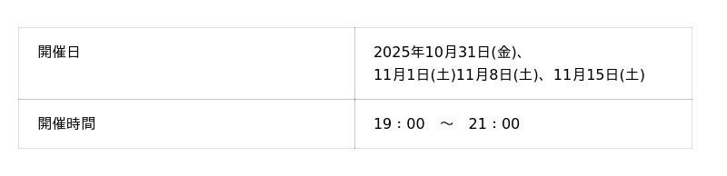 当ホテルでは、2025年10月31日(金)、11月1日(土)、11月8日(土)、11月15日(土)の4日間で
