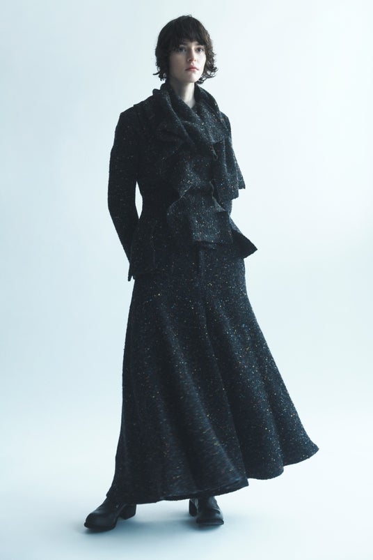 POP-UP STOREでは、ショーピースから着想を得た、白と黒のコントラストが際立つツイード素材のセットアップや、キルティング加工により温もりと柔らかさを兼ね備えたコートなどを展開いたします。