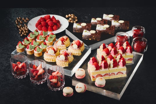 ショートケーキ、タルト、フルーツパフェ、ガトーショコラ、マカロンなどがずらり。苺やチョコレートの、華やかなクリスマスの装いをまとったスイーツが並びます。