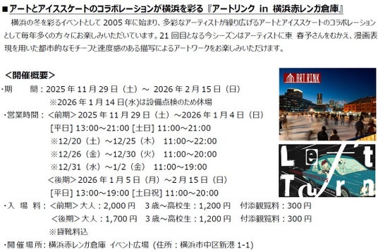 また、横浜赤レンガ倉庫1号館 ・ 2号館だけではなく、隣接するイベント広場・赤レンガパーク・新港中央広場でも、日本有数のクリスマスマーケットとして例年多くのお客様にお越しいただく、『Christmas Market in 横浜赤レンガ倉庫』を開催。今年は過去最大約12mのクリスマスツリーやイベント初となる「新港中央広場」での新エリアの登場など注目ポイントも目白押しです。さらに、イベント広場では横浜の冬を彩るイベントとして、アートとアイススケートのコラボレーションが楽しめる『アートリンク in 横浜赤レンガ倉庫』も開催。21回目となる今シーズンはアーティストに東 春予さんをむかえ、漫画表現を用いた都市的なモチーフと速度感のある描写によるアートワークをお楽しみいただけます。
