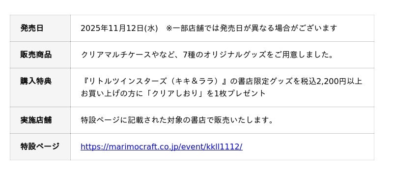 株式会社マリモクラフト(本社:東京都江東区)は、2025年11月12日(水)より、『リトルツインスターズ(キキ&ララ)』の書店限定グッズを対象書店にて発売いたします。