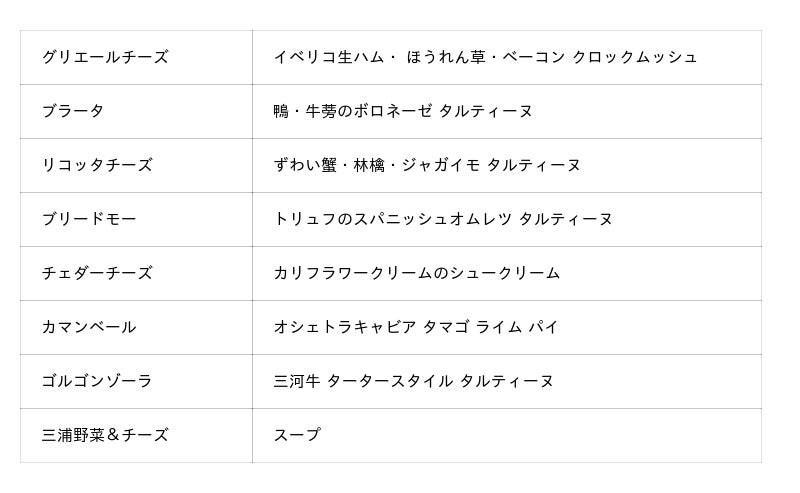 野菜は、神奈川県から直送されるブランド野菜「三浦野菜」をはじめ、その時期に最もおいしい状態で届く旬野菜を使用。温暖な気候と豊かな土壌に育まれた素材が、チーズや食材と調和し、彩り豊かな一皿を完成させます。