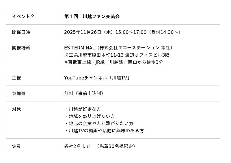 川越の魅力を動画で発信するYouTubeチャンネル「川越TV」(運営:株式会社エコーステーション)は、地域を愛する人々がリアルにつながる場として、「第1回 川越ファン交流会」を2025年11月26日(水)に「ES TERMINAL(埼玉県川越市)」で開催します。